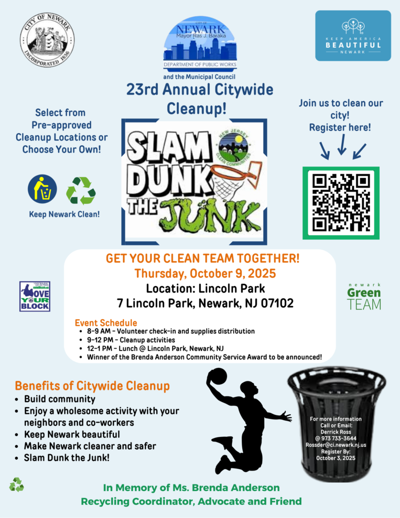 Newark Public Works is hosting “Slam Dunk the Junk” once again on October 9, 2025, in honor of the late Brenda Anderson, Former Recycling Coordinator.