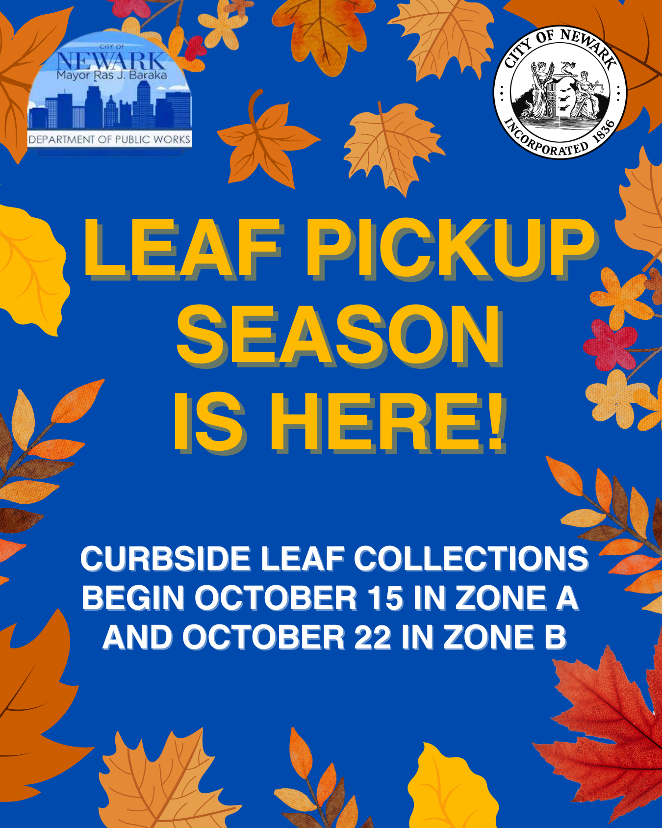 Keep your block leaf-free this fall season with Newark DPW’s Annual Leaf Recycling Program! Curbside collections will begin October 15, 2025. Leaves and yard waste can also be dropped off at your nearest service center.